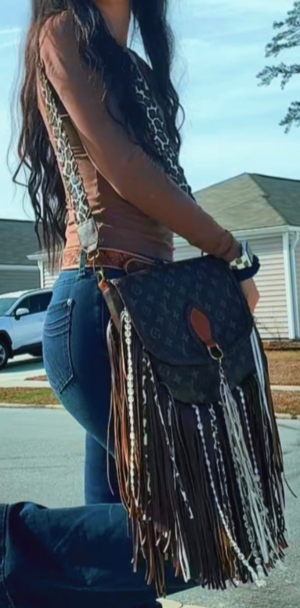 This bag is everything. We are completely obsessed with it! It features the initial pattern with fringe around the edge. Has a custom leopard shoulder strap for comfortable wearing. Make your outfit complete with this trendy western but affordable inspired bag that will be sure to turn heads! They are incredible quality and sure to last you for a very long time. Turn around time is approximately 3 -4 weeks.